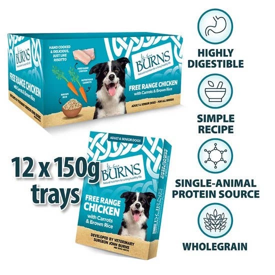Burns Wet Dog Food is hand cooked in Wales and made with responsibly sourced ingredients, the Burns Adult & Senior Wet Dog Food with Free Range Chicken, Carrots & Organic Brown Rice is the perfect convenient alternative to home cooking. This healthy food is hypoallergenic, gluten free and made using natural ingredients and single source protein, making it suitable for adult and senior dogs of any breed, fussy eaters and even the most sensitive dogs. Previously known as Penlan Farm, this complete wet food contains only wholesome ingredients such as organic chicken, organic wholegrain brown rice, carrots, vitamins and minerals, with no hidden surprises, ensuring that your dog is getting only the very best.