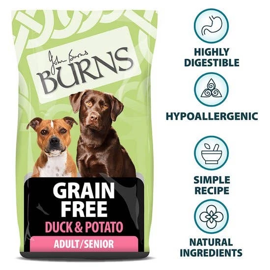 Burns Grain Free Adult & Senior Dog Dry Food with Duck & Potato uses buckwheat to maintain all the nutritional benefits of wholegrains whilst providing a grain-free alternative for the dogs that need it. Duck itself is a novel protein source, and this hypoallergenic diet uses only natural ingredients and contains all the nutrients your dog needs to thrive.
