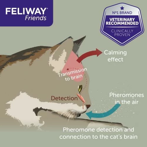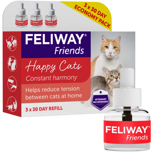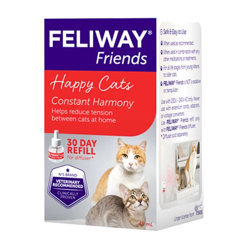 Feliway Friends Cat Calming Diffuser Refill is designed and clinically proven to help minimise and even outright prevent fighting and tension between household cats. If your cats are frequently fighting with each other, hissing, growling, or spitting, or hiding from each other, Feliway Friends may help to reduce these signs of conflict. This refill is to be used exclusively with the Feliway Friends Diffuser unit.