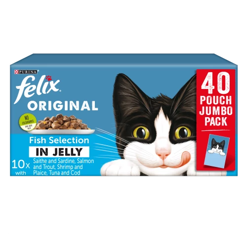 Individually foil sealed to keep in the taste cats love, each pouch is a perfect balance of delicious flavour & convenience; just snip it open, pour out the succulent meaty chunks smothered in jelly, & let your cat become a Felix cat! With a mouth watering selection of flavours like Tuna & Cod, Salmon & Trout, Shrimp & Plaice, and Pollack & Sardine, Felix cats are spoiled for choice!