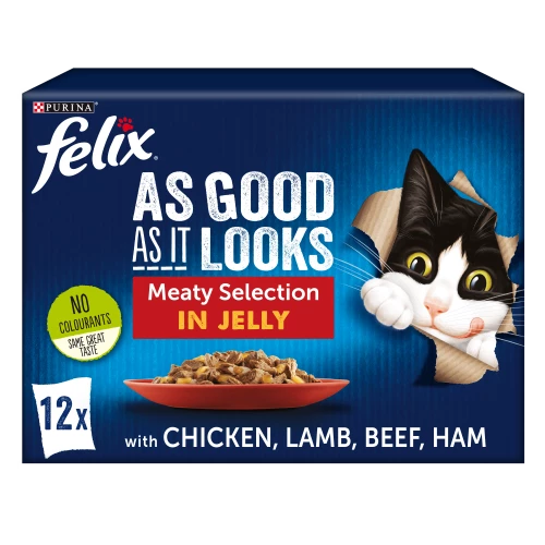 Felix As Good As It Looks Meaty Selection in Jelly Adult Cat Food pouches are so irresistible, your cat won’t be able to wait for the bowl to hit the floor! A nutritionally complete, balanced cat food loaded with all the good things a clever cat needs, such as Omega 6 and vitamins D & E, to keep them happy, healthy and in the prime of life!