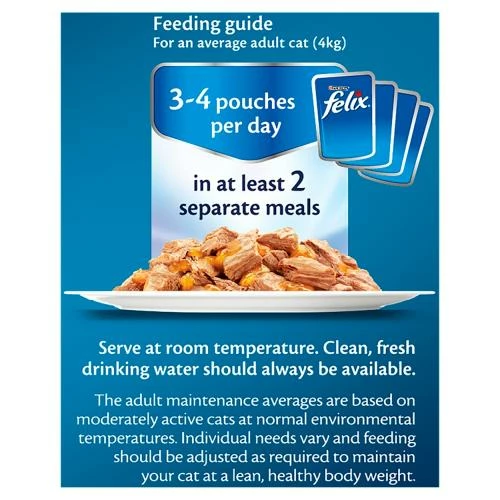 Individually foil sealed to keep in the taste cats love, each pouch is a perfect balance of delicious flavour & convenience; just snip it open, pour out the succulent meaty chunks covered in jelly, & let your cat become a Felix cat! With a mouth watering selection of flavours like Chicken, Beef, Ham & Lamb, Felix cats are spoiled for choice!