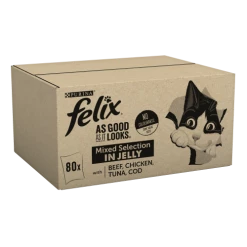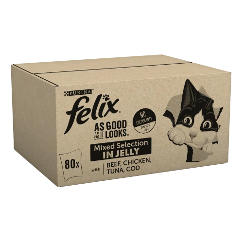 Individually foil sealed to keep in the taste cats love, each pouch is a perfect balance of delicious flavour & convenience; just snip it open, pour out the succulent meaty chunks smothered in jelly, & let your cat become a Felix cat!