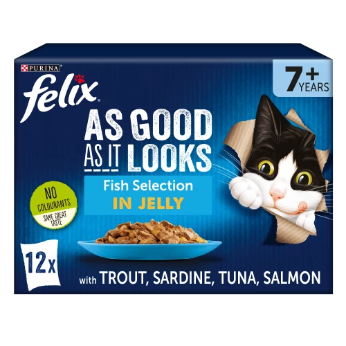 Felix As Good As It Looks’ delicious Fish Selection, formulated especially for senior cats (aged 7 and over), is so irresistible your cat won’t be able to wait for the bowl to hit the floor! Did you know that 40% of your cat’s life is spent as a senior? And as your cat starts to get on in years, their dietary needs will change too.Â