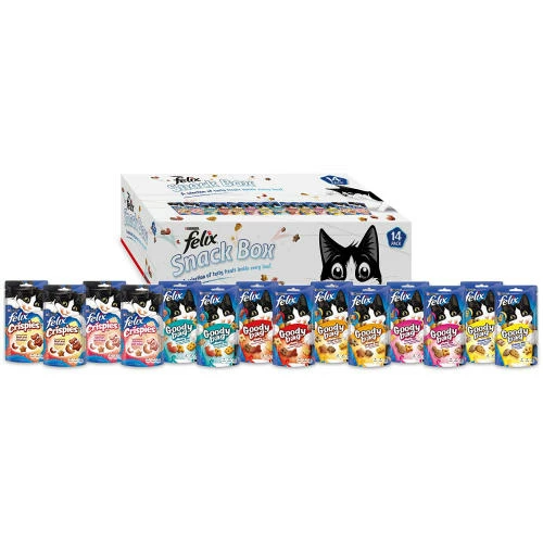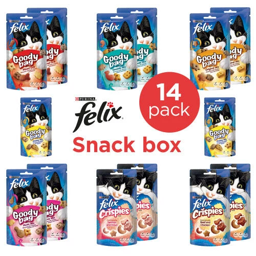 Felix Snack Box contains a delicious selection of 14 Felix Treats including Goody Bags and Crispies for you to treat your cat with, they’ll be spoiled for choice!
