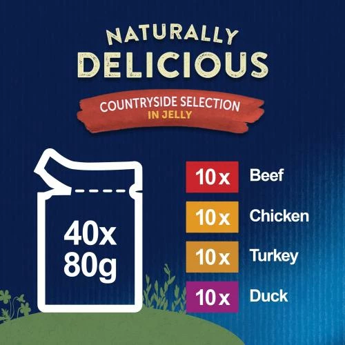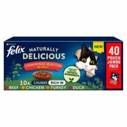 Felix Naturally Delicious Countryside Selection in Jelly Adult Cat Food is a complete, delicious grain free recipes selection for cats. Each recipe is 100% steam preserved, made with selected natural ingredients, at just the right temperature and served in an irresistibly tasty jelly.