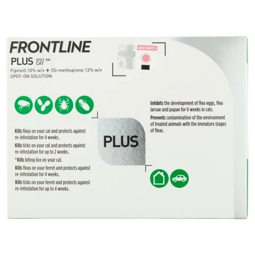 FRONTLINE Plus Flea & Tick Spot On Treatment for Cats kills fleas, ticks and lice and stops flea eggs hatching in your home. It is fast acting and kills fleas within 24 hours and ticks within 48 hours. Frontline Plus is a double action formula that also attacks eggs and larvae, preventing them from hatching in your home to keep your household parasite free for longer.