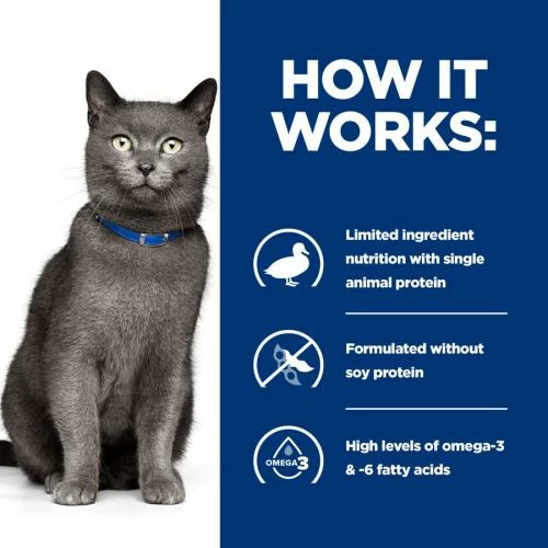 Hills Prescription Diet DD Food Sensitivities Duck & Green Pea Dry Cat Food is formulated for the nutritional management of cats with food allergy and intolerance.