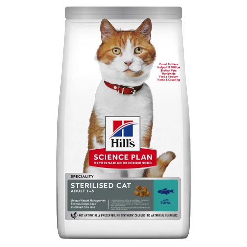 Hills Science Plan Sterilised Dry Tuna Adult Cat Food provides a unique weight management formula to keep your sterilised cat lean. After sterilisation, cats may suffer from weight gain, as well as an increased likelihood of urinary problems. At the same time, appetite increases and energy needs decrease.