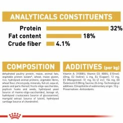 Protein 31.2%, Fat content 10.1%, Crude fibre 1.3%, Crude ash 5.4%, L-lysine 2.2%, Calcium 0.78%, Phosphorus 0.70%, Sodium 0.42%, Potassium 0.68%, Magnesium 0.09%; per kg: Vitamin A 5,853IU, Vitamin D3 639IU, Vitamin E 500mg, Vitamin C 90mg, Beta-carotene 1.5mg, L-Carnitine 528mg.
