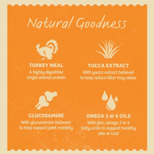Using all our knowledge and experience, we’ve created James Wellbeloved Turkey Senior Cat Wet Pouch. We take a handful of ingredients from nature, one source of animal protein and combine them with all the vitamins and minerals your cat needs. And all the great taste it deserves. For added peace of mind, it’s naturally hypoallergenic so less likely to cause an adverse food reaction, made without cereals such as rice and barley for those more sensitive cats and you will never see any added artificial colours, flavours or preservatives. Not now, not ever.
