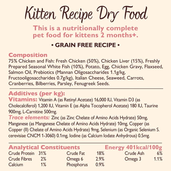 With 75% meaty greatness from freshly prepared chicken and offal, it has lots of protein and calcium to help your kitten grow big and strong. It’s a nutritionally complete and balanced recipe with no grains, meat meal or nasties, which makes it naturally healthy for your kitten.