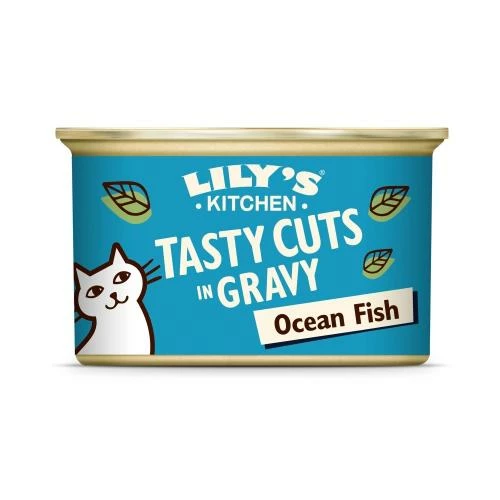 Lilys Kitchen Ocean Fish Tasty Cuts in Gravy Wet Cat Food contains scrumptious chunks of fish with a texture that cats love so much!