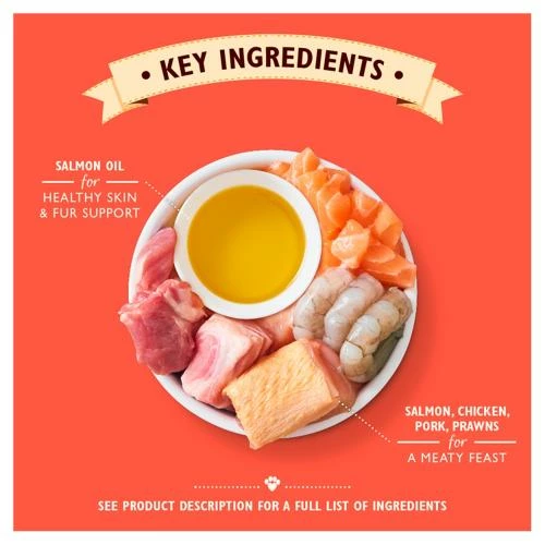 Salmon 30%, Chicken 15%, Pork 15%, Prawn 5%, Salmon Oil, Chelated Minerals.