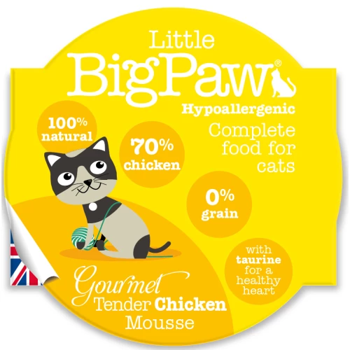 Little Big Paw Gourmet Tender Chicken Mousse suits the large energy requirements and fast metabolism of your cat. Produced with the help of leading nutritionists, Little Big Paw Cat is high in energy, nutrient dense and rich in calories – so a little amount of food is bursting with energy! Just like the big cats of the wild, your cat is a carnivore and therefore needs a high level of meat to ensure maximum health. A high percentage of meat isn’t just desirable for cats, its essential!