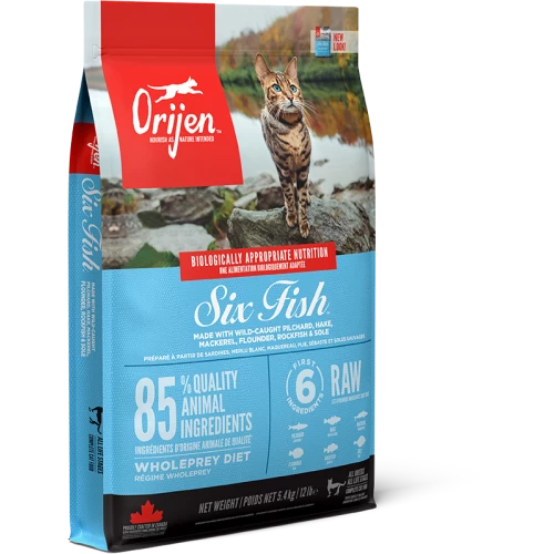 ORIJEN Six Fish diet is made with fish from raw* wild-caught pilchard, hake, mackerel, flounder, rockfish and sole. Packed with WholePrey animal ingredients like fish, organs and bone, ORIJEN Six Fish diet is made with the most nutrient-dense, succulent parts of the prey to deliver the nutrition cats need. With 85%** quality animal ingredients and a freeze-dried liver coating, this diet is beyond comparison.