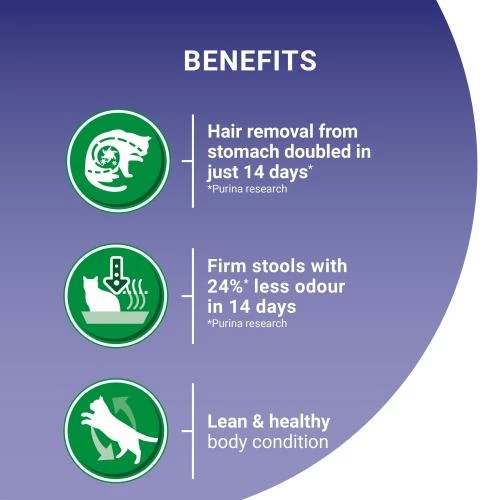- With fibres, proven to carry away twice as much hair from the stomach in just 14 days* *Purina Research