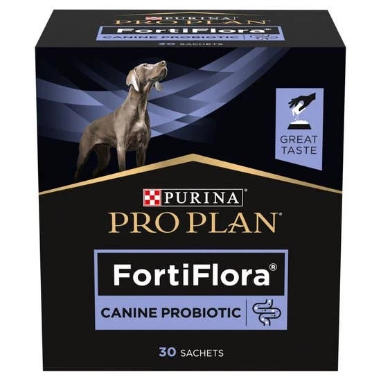 PURINA PRO PLAN® FortiFlora® is a supplement containing live bacteria to promote intestinal health, microflora balance and a strong immune system. FortFlora® Dog can be used for exciting or stressful situations and help manage digestive upsets or loose stools. This tasty supplement is to be used once daily and can easily sprinkle on your dog’s food.