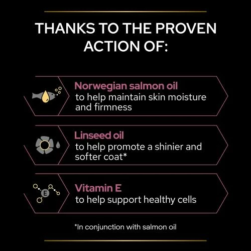 PRO PLAN Adult and Senior Skin & Coat Cat Supplement has been formulated to help nourish your cat’s skin and coat from the inside out, as it contains key nutrients (such as omega 3 & 6 fatty acids from Norwegian salmon oil, linseed oil and vitamin E), and is scientifically designed to help support healthy skin (moisture & firmness) and a lustrous coat.