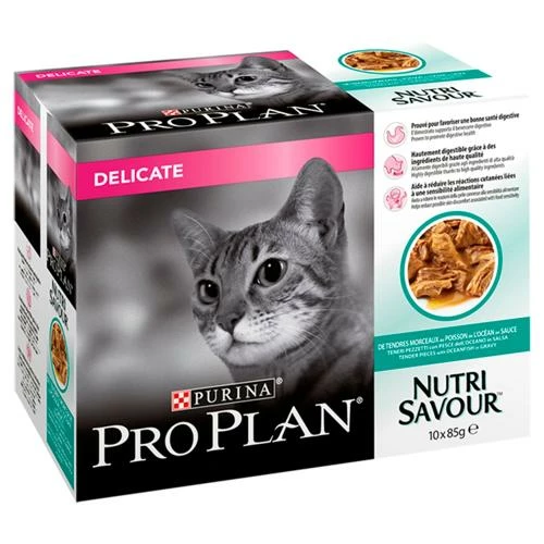 PRO PLAN NUTRISAVOUR Fish in Gravy Delicate Adult Cat Pouch contains nutrients specifically chosen to help ease your cat’s sensitivity. It’s a complete and balanced pet food they’ll love. NUTRISAVOUR Adult DELICATE is made with tender ocean fish in a delicious gravy. Each pouch contains highly digestible, high quality ingredients, and our special formula contains a prebiotic that’s proven to promote digestive health.