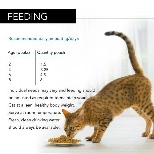 For an average adult cat (4kg), feed 3 pouches per day in at least 2 separate meals. The adult maintenance averages are based on moderately active cats at normal environmental temperatures. Individual needs vary and feeding should be adjusted as required to maintain your cat at a lean, healthy body weight. Serve at room temperature. Fresh, clean drinking water should always be available.