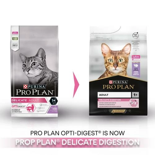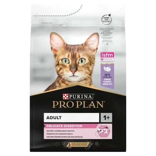PRO PLAN Turkey Delicate Sensitive Digestion Dry Adult Cat Food is a complete and balanced dry food for Adult cats 1+ specially formulated for cats with sensitive digestion or fussy appetites.