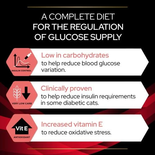 PURINA VETERINARY DIETS DM is a scrumptious clinical recipe designed to help diabetic adult cats better regulate their glucose levels, scientifically demonstrated to minimise your pet’s reliance on external insulin sources. Formulated with exceptionally low carbohydrate levels in order to reduce hyperglycaemia, Feline DM is also rich in vitamin E, an antioxidant, to help counteract the increased oxidative stress that can arise in diabetic cats.