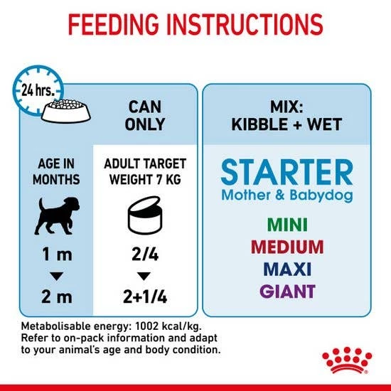 ROYAL CANIN® STARTER Mother & Babydog Wet Dog Food contains all the high-quality nutrients your dog needs to support it through the demanding gestation and lactation periods by containing a high protein, energy, and mineral content, ROYAL CANIN® STARTER Mother & Babydog Wet Dog Food also caters to the dietary requirements of weaning puppies up to 2 months old by supporting them during the sensitive transition period from maternal milk to solid food.