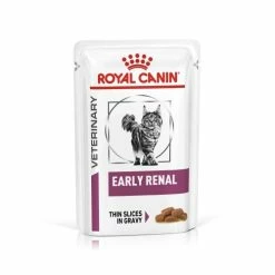 Royal Canin Early Renal (in gravy) Adult Wet Cat Food is suitable for Early Chronic Kidney Disease without proteinuria (IRIS stage 1*) and/or Senior cats over 7 years of age screened at risk 1. This product is not suitable in cases of growth, gestation, 1.lactation cats screened at risk with Renal Detectâ„¢ tool via the Royal Canin Veterinary Services platform. This product should only be fed based upon the specific recommendation of your vet.