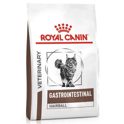 Royal Canin Veterinary Diets Gastrointestinal Hairball Dry Adult Cat Food contains a specific blend of fibres (including psyllium) to help eliminate ingested hair and control hairball formation.