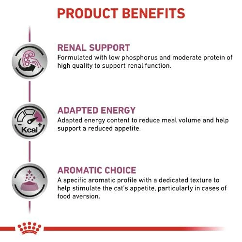 Royal Canin Veterinary Diets Renal Cat Food Pouches is a complete dietetic feed for adult cats, formulated to support renal function in the case of chronic or temporary renal insufficiency, through its low level.