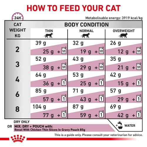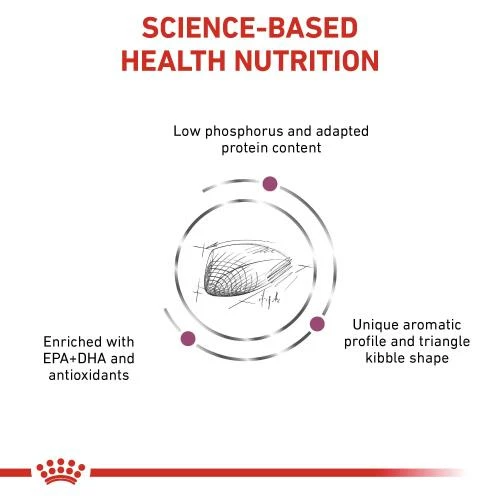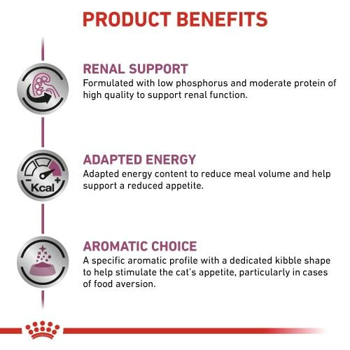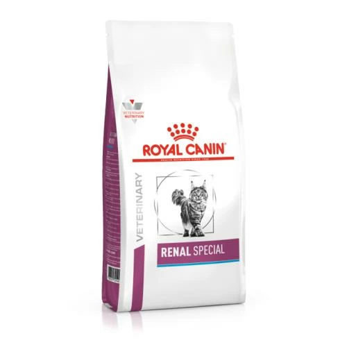 Royal Canin Veterinary Diets Renal Special Dry Adult Cat Food is a complete dietetic feed for cats formulated to support renal function in the case of chronic or temporary renal insufficiency, through its low level of phosphorus and high quality protein and to reduce oxalate stone formation, through its low level of calcium and vitamin D, and its urine alkalising properties.