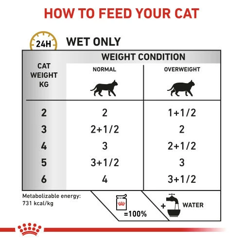 ROYAL CANIN Urinary S/O Moderate Calorie in Gravy is specially formulated with the nutritional needs of cats with urinary sensitivities in mind. The nutrients included in this exclusive formula help to dissolve all types of struvite stones, whilst also lessening the likelihood of reformation. ROYAL CANIN Urinary S/O Moderate Calorie in Gravy is developed with Relative Super Saturation (RSS) methodology and helps to lower the concentration of ions that play a part in the formation of bladder stones. ROYAL CANIN Urinary S/O Moderate Calorie in Gravy’s reduced calorie content helps your cat to maintain an ideal weight for optimal wellbeing. As part of the ROYAL CANIN Veterinary Range, it is important that this product is only given to your pet when recommended by a veterinary professional.