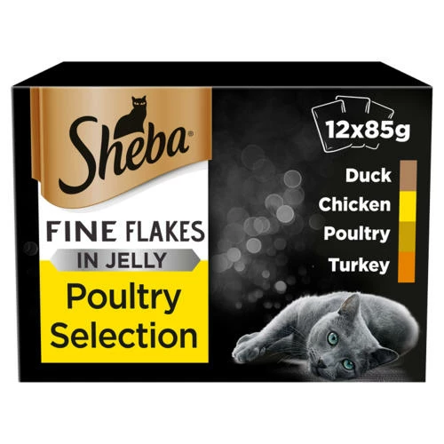 Sheba Fine Flakes in Jelly recipes are a wet cat food with scrumptious flakes, carefully prepared in a divine, melting jelly your cat will adore. Fine Flakes cat food is the perfect pet food choice to inspire a nuzzle of affection. Choose Sheba Fine Flakes cat food with Poultry in Jelly, available in 80 x 85g handy Sheba pouches. A 100% Complete and Balanced wet cat food with no artificial colours or preservatives.