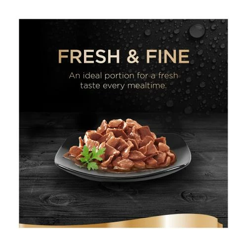 - Delicately sliced pieces served in a tender gravy. An ideal serving for fresh-tasting cat food every mealtime