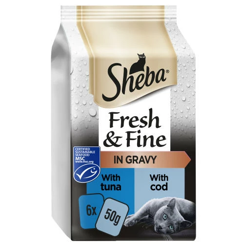 Sheba Fresh & Fine Tuna & Cod in Gravy Wet Adult Cat Food is prepared with quality ingredients that your cat will love. Every recipe is made with small, finely sliced pieces of fish in a tempting gravy and always freshly served because of the small portion. Feeding your cat Sheba Fresh & Fine will satisfy her feline appetite and will be a pleasure to you every time.