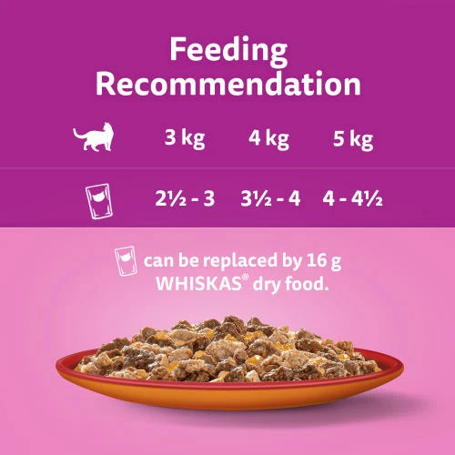 Whiskas 1+ Duo Meaty Combos adult cat food pouches in jelly combine two of your cats favourite flavours in one glorious meal, without compromising on nutrition. Each wet cat food pouch is crafted with two irresistible flavours for a divine taste sensation that even the fussiest of cats cannot resist! Purrs guaranteed.