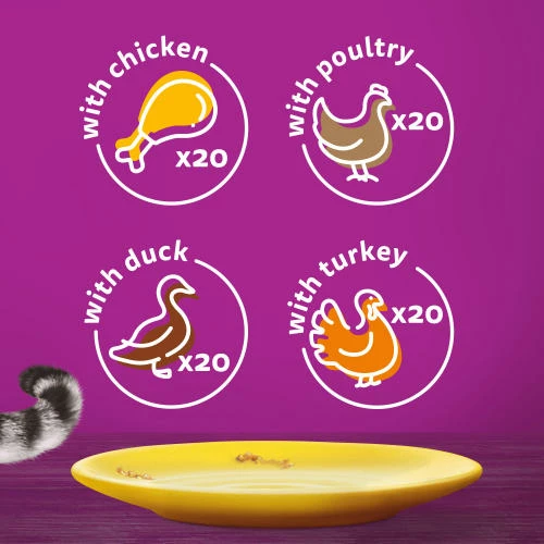 Whiskas 1+ Poultry Feasts in Jelly Wet Adult Cat Food has been specially created to suit the needs of your cat, providing all the nutrition and energy she needs to live life to the full. Each pouch is nutritionally complete and balanced, with mineral levels to support a healthy urinary tract and zinc to care for your cat’s skin and promote a glossy coat.