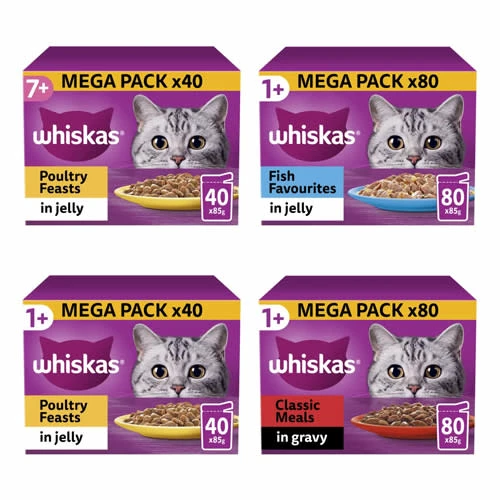 Each Whiskas Bulk Saver Pack offers offers 4 tasty flavours, with each pouch bursting with tender meaty pieces. Free from artificial colours, flavours and preservatives.
