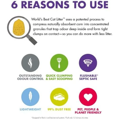 World’s Best is a revolutionary alternative, all natural, organic break-through in scoopable cat litter. Made from whole kernel corn, it’s 99% dust-free and contains no clays, silica dust, synthetic binding or dust reducing agents. It’s odour control is second to none and it’s also totally flushable!